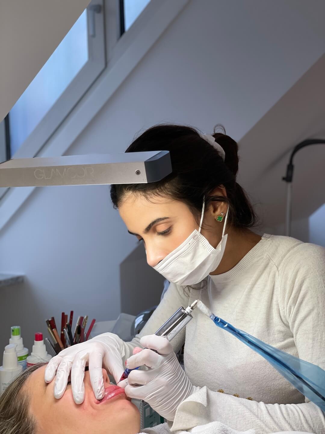 Ein besonders wichtiger Bestandteil der Ausbildung war das Vorzeichnen der Form – eine Fähigkeit, die viel Übung und ein geschultes Auge erfordert. Bevor pigmentiert wird, wird die gewünschte Form exakt auf das Gesicht abgestimmt: bei Augenbrauen, Lidstrichen oder Lippen.